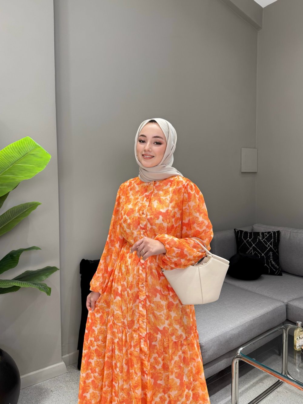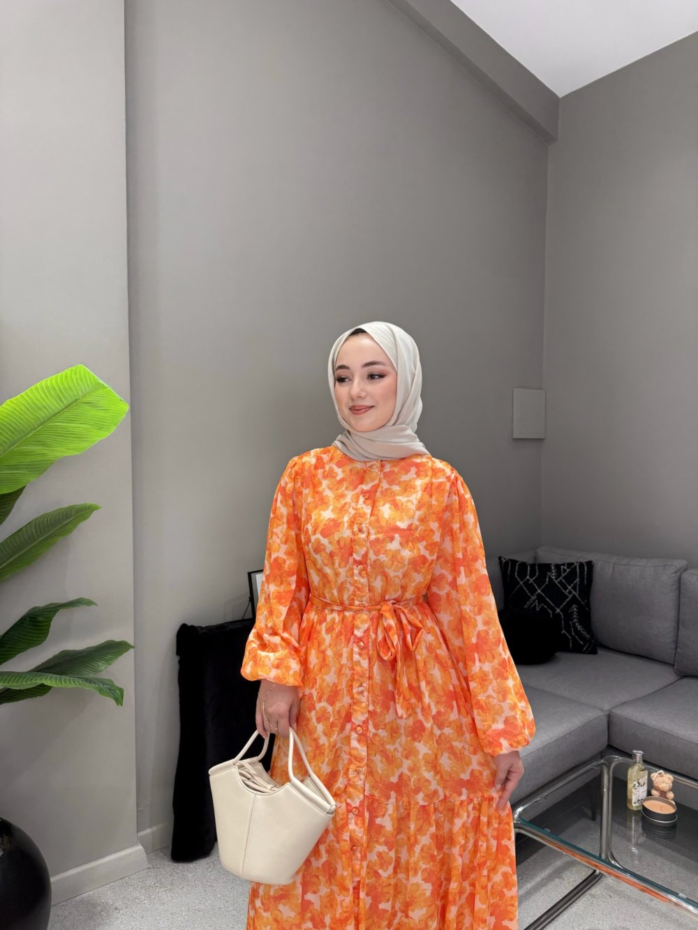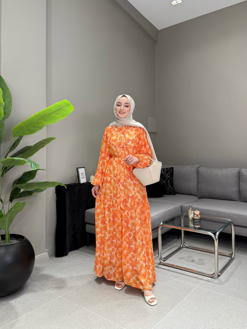 Notre article est fabriqué en tissu chiffon imprimé. Il possède des boutons recouverts de tissu sur toute la longueur. Il est entièrement doublé, y compris les manches. Il est livré avec une ceinture amovible.